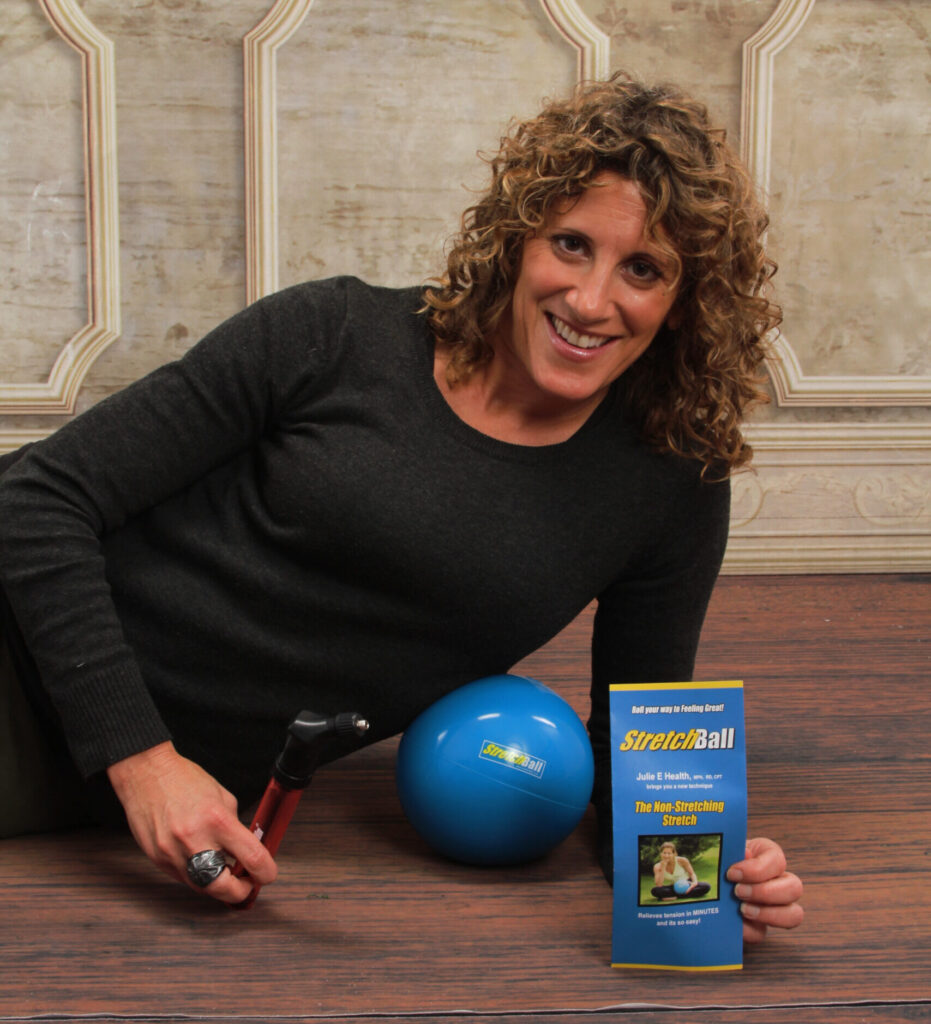 Based on her learnings from years of teaching fitness classes, Julie made the StretchBall™ an evolution in well-being. Stretching is just as important to health and body functioning as regular exercise, yet most people spend little to no time doing it. When we stretch, we get long, lean, flexible muscles and we are less likely to get hip, knee, back and neck pain. Rolling and breathing on the ball gives the best stretch and massage you’ve had in your life. It feels great, it’s easy to use, and it’s portable.