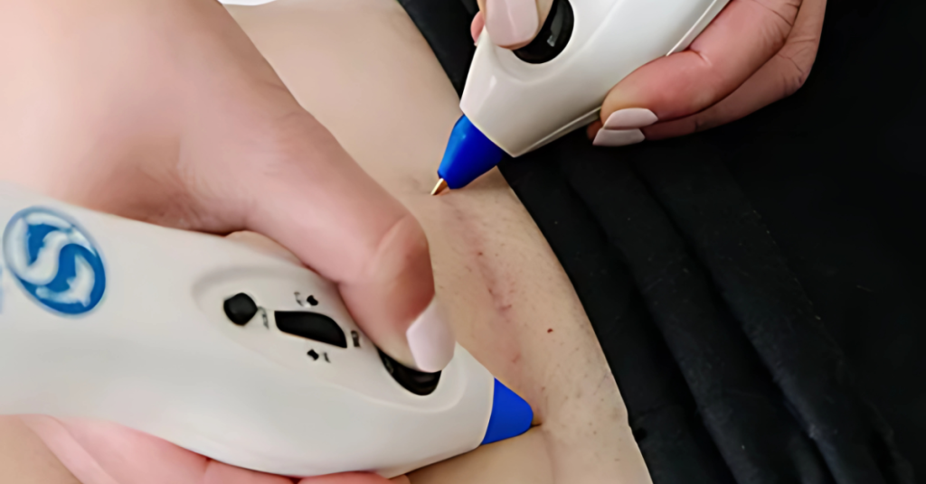 Our Scar Release Technique uses the Dolphin Neurostim a cutting-edge microcurrent point stimulation (MPS) device to target and treat scar tissue. This gentle, non-invasive therapy works by: